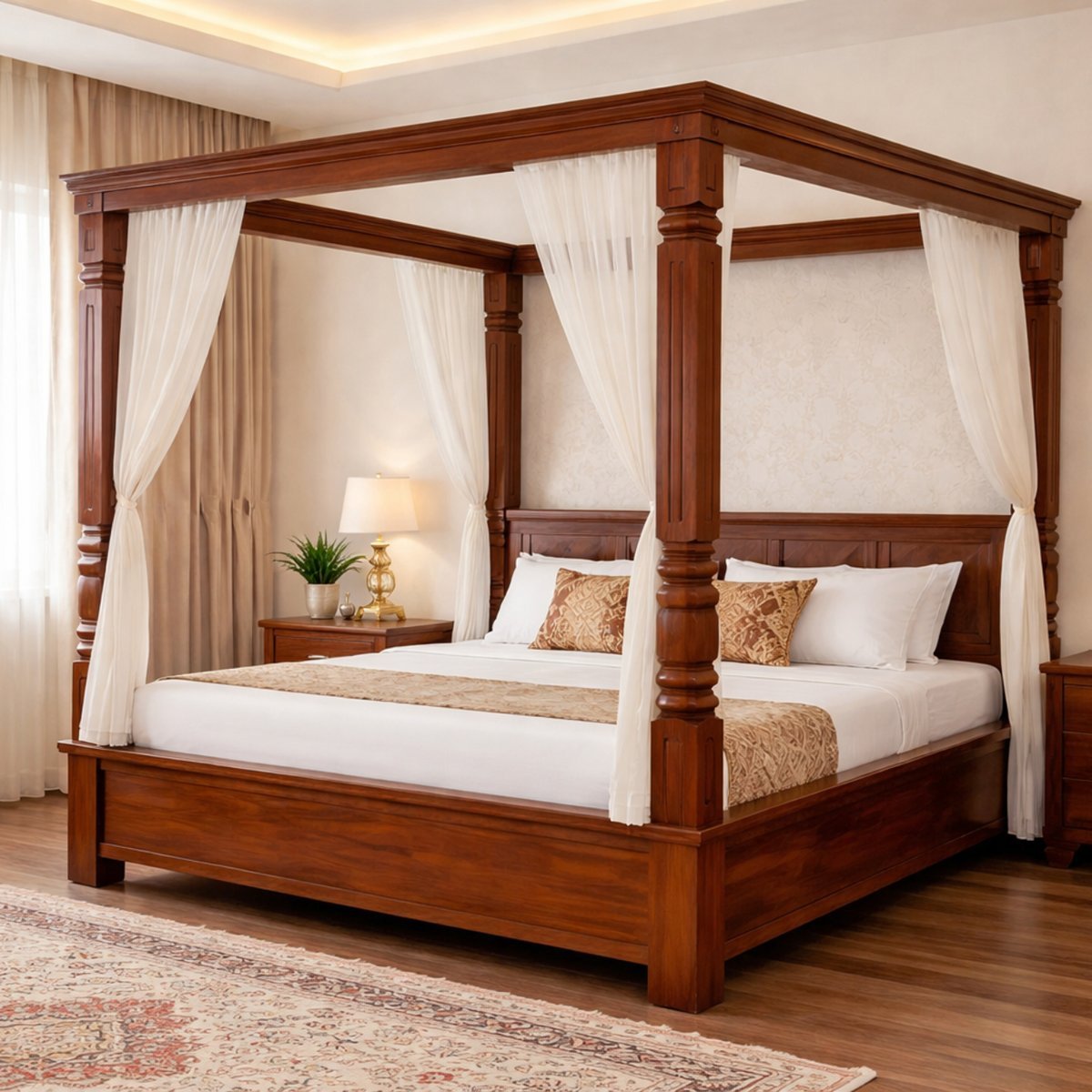 - Bed Design: Four-poster canopy frame with integrated top structure