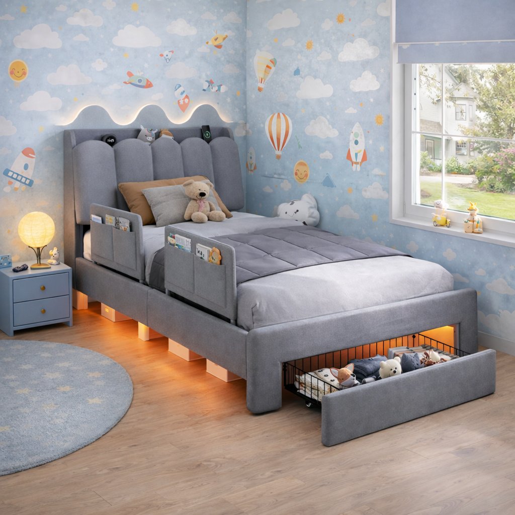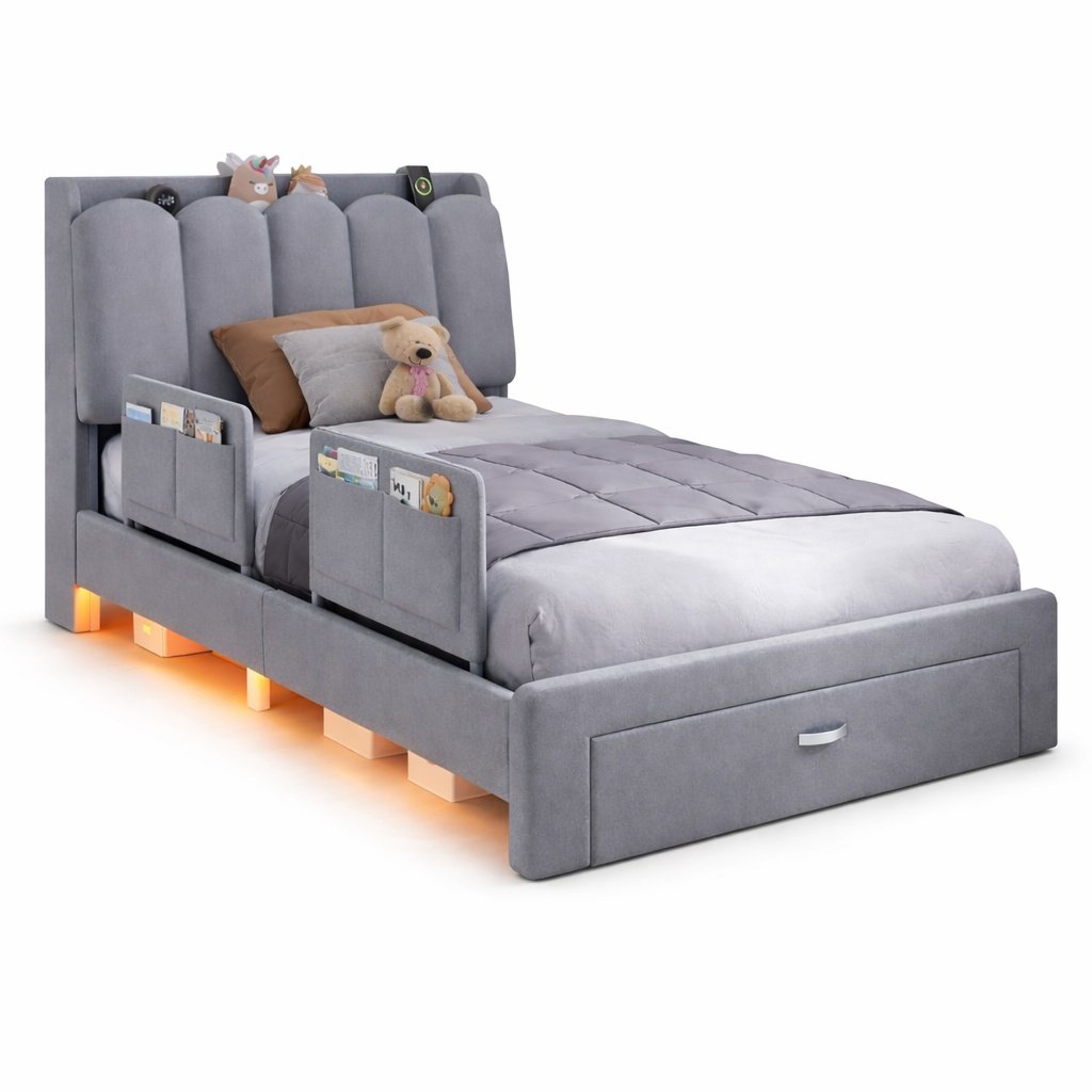Kids Upholstered Storage Bed Frame with Safety Side Rails & Soft-Headboard