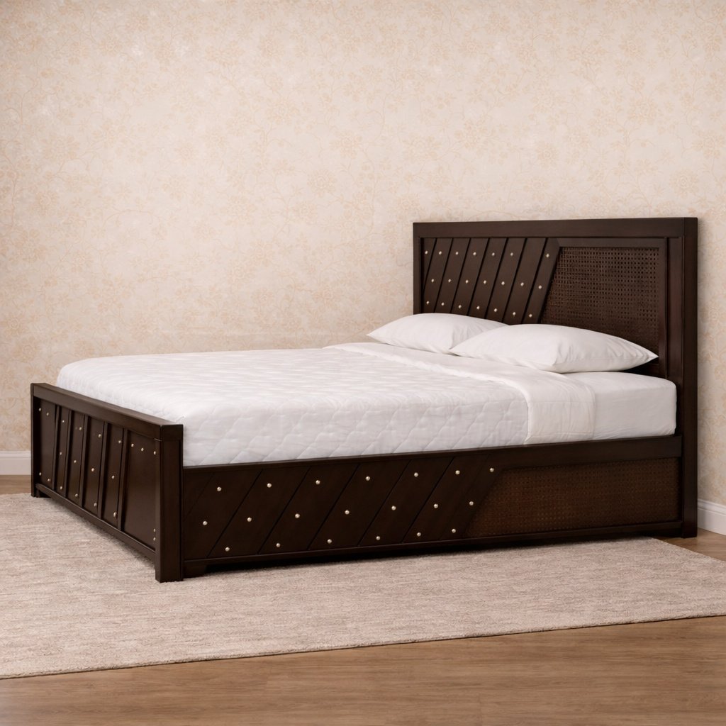 ₹44159 35% OFFThis elegant wooden bed showcases a refined blend of modern craftsmanship and classic detailing. The diagonally paneled headboard and footboard, accented with subtle stud elements, add texture and visual interest while maintaining a balanced, sophisticated look. The rich wooden finish enhances its premium appeal, making it suitable for contemporary, transitional, and upscale bedroom interiors.