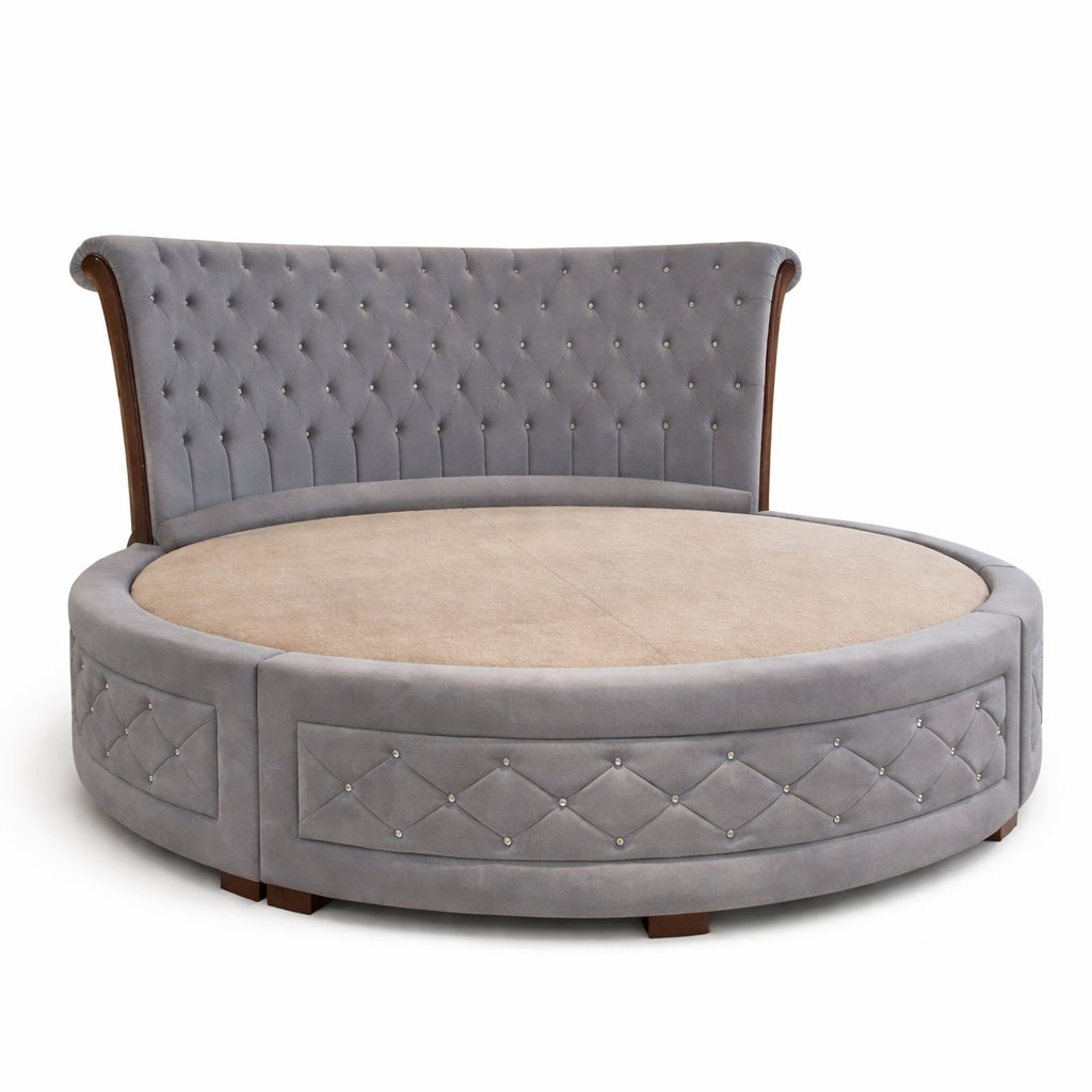 - Bed Design: Round upholstered bed with curved, button-tufted headboard and upholstered base