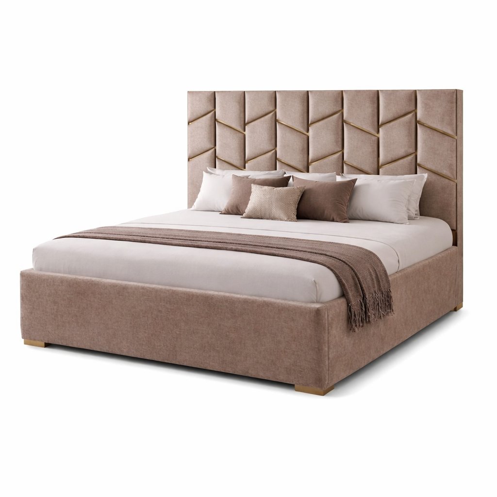 Luxury Upholstered Bed Frame with Chevron Panel Headboard & Gold Accent Lines