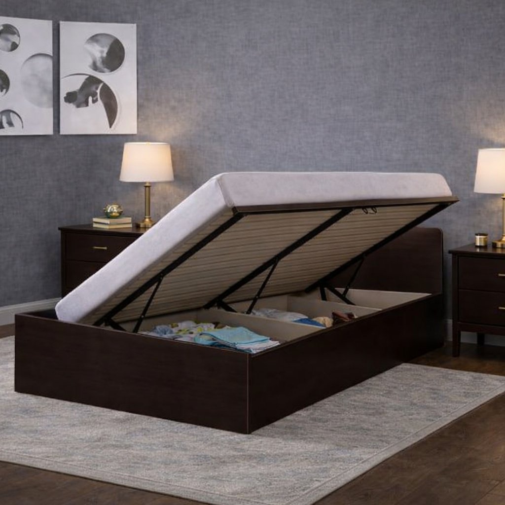 - Bed Design: Clean-lined wooden frame with lift-up hydraulic storage mechanism
