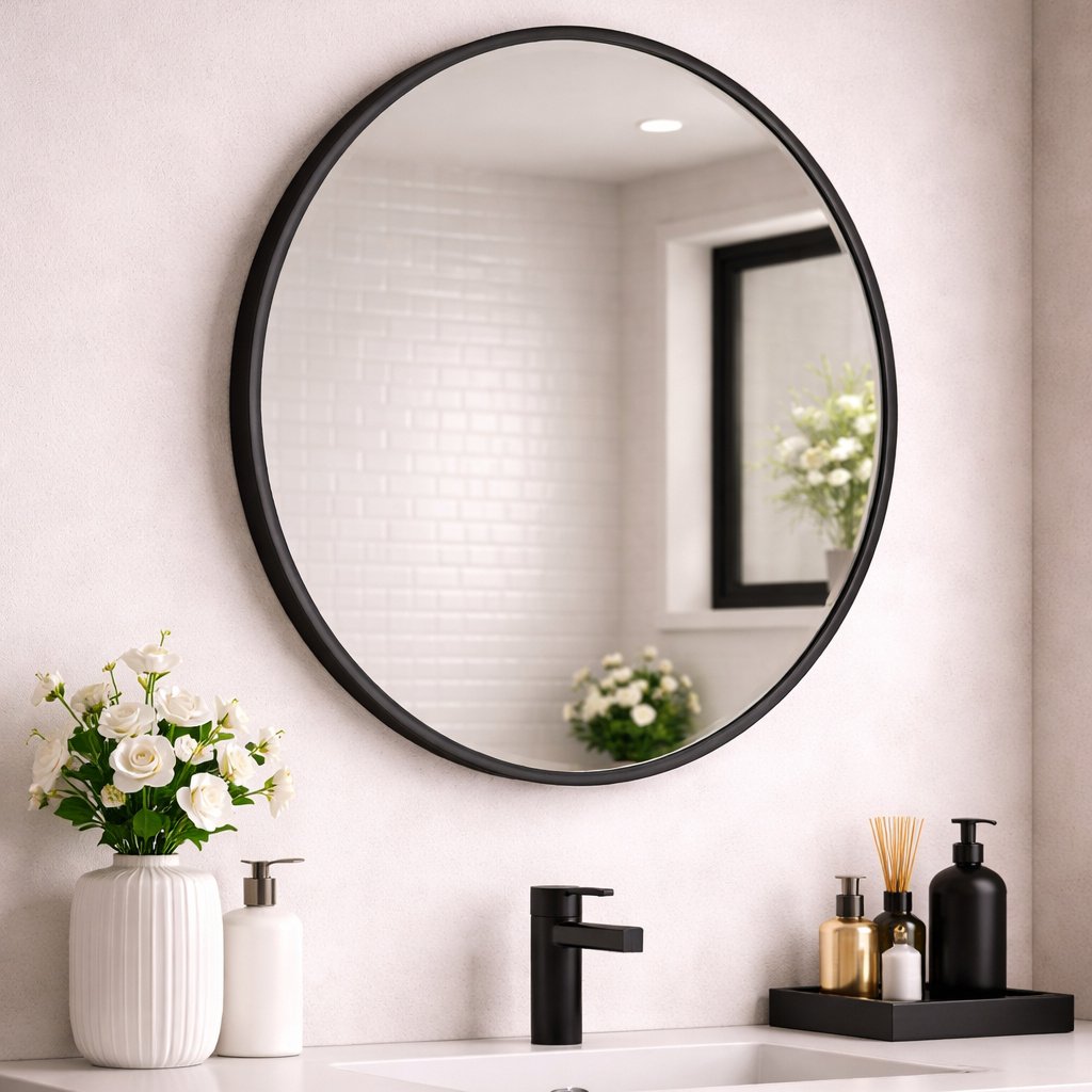 Luxury Round Wall Mounted Bathroom Mirror with Matte Black Metal Frame