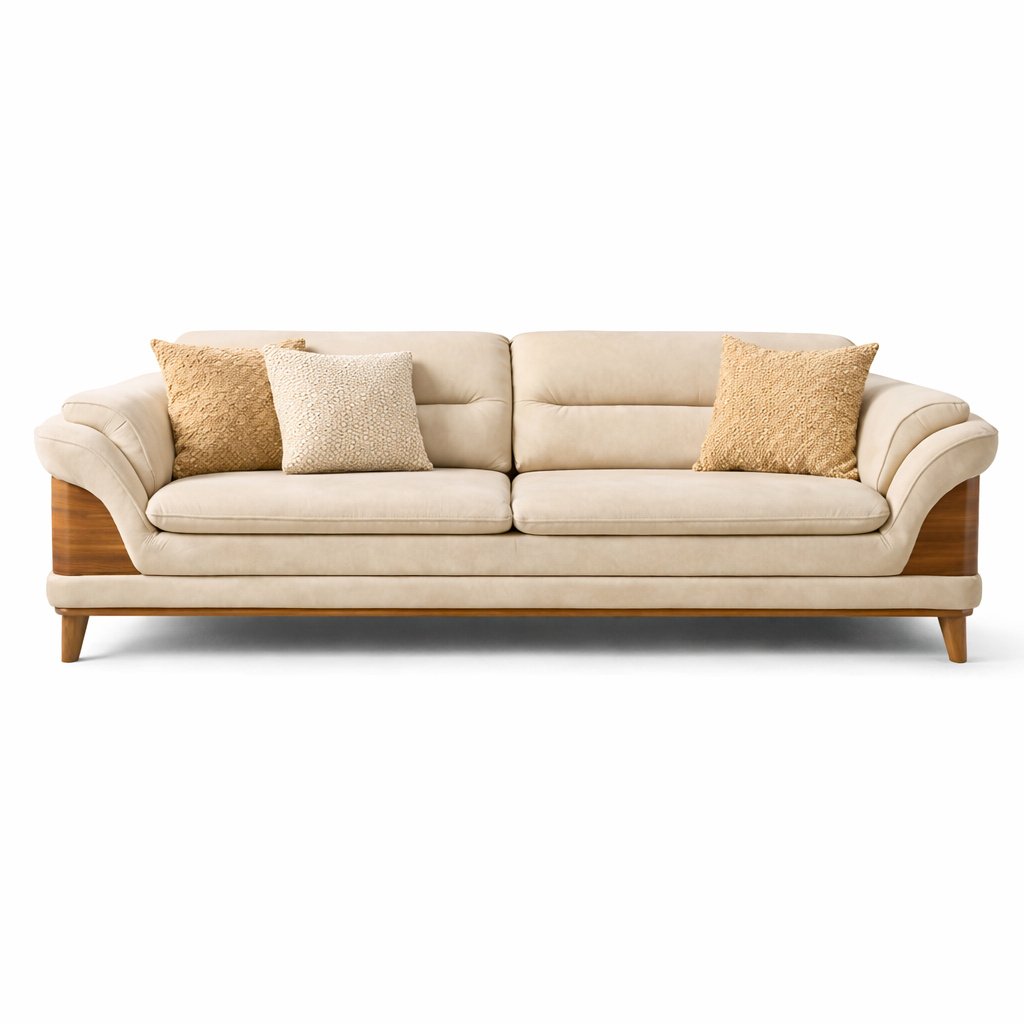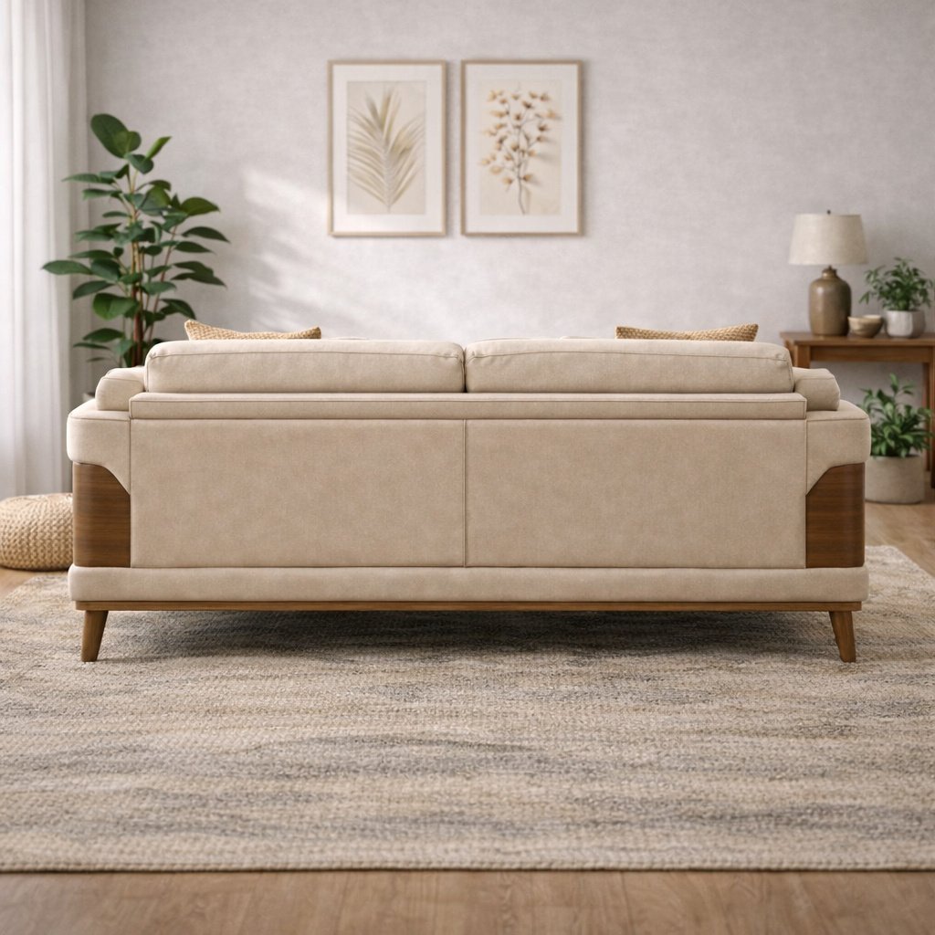₹44429 35% OFFDesigned for refined everyday comfort, this elegant three-seater sofa showcases a softly contoured silhouette with gently flared arms and a supportive, well-cushioned seat. The warm neutral upholstery is beautifully complemented by exposed wooden side panels and tapered wooden legs, creating a harmonious blend of modern sophistication and classic warmth.