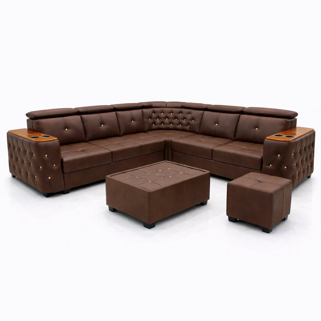 Built for both comfort and functionality, the sofa offers deep, generously padded seating with supportive backrests and adjustable headrest cushions for enhanced relaxation. Integrated wooden side consoles with cup holders add everyday convenience, while the modular layout allows flexible arrangements to suit different room sizes without compromising on style.